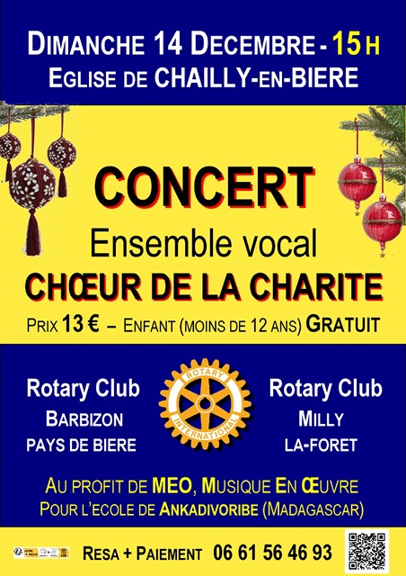 Les Rotary Club de Barbizon-Pays de Bière et Milly-la-Forêt organise un concert le 14 décembre à 15h en l’église Saint-Paul de Chailly-en-Bière, au profit de l’école de Ankadivoribe (Madagascar).