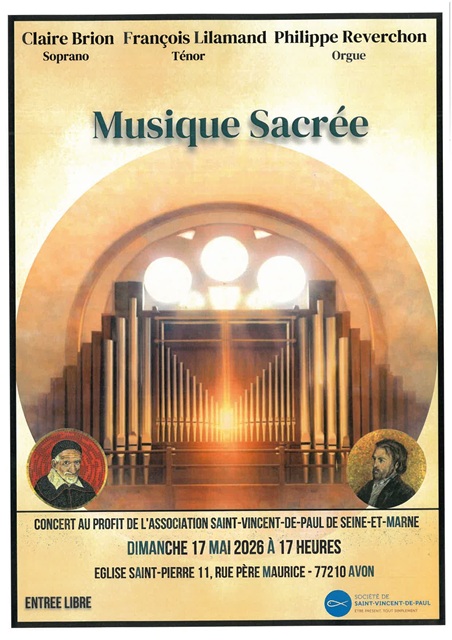 Le dimanche 17 mai à 17h, un concert de musique sacrée, donné par Claire Brion (soprano), François Lilamand (ténor) et Philipper Reverchon (organiste), aura lieu en l’église Saint Pierre d’Avon au profit de l’Association Saint Vincent de Paul de Seine-et-Marne, qui vient en aide aux plus démunis.