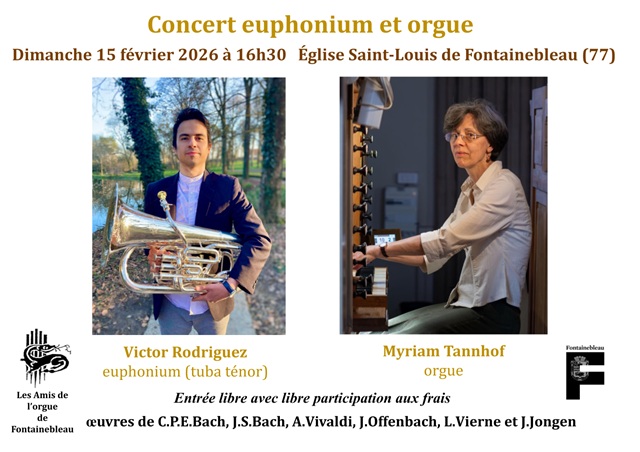 Dimanche 15 février à 16h30, un concert orgue et euphonium sera donné à l’église Saint-Louis de Fontainebleau par Victor Rodriguez, euphoniste et Myriam Tannhof, organiste. Au programme : J.Offenbach, J.Jongen, L.Vierne, J.S.Bach, A. Vivaldi, C.P.E.Bach . Entrée gratuite avec libre participation aux frais.
