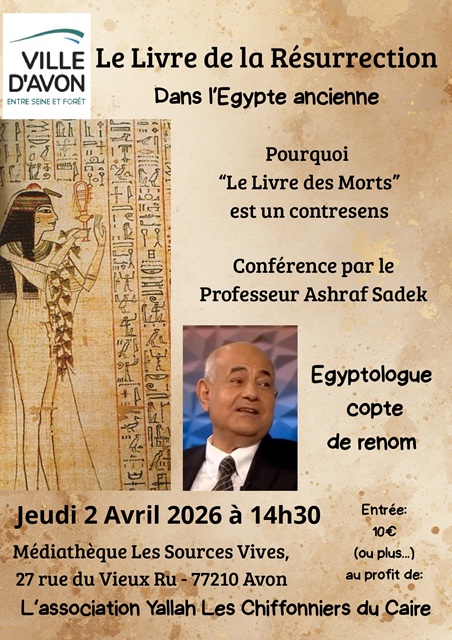 L’association YALLAH Chiffonniers du Caire organise une conférence le jeudi 2 avril à 14h30 à la médiathèque d’Avon sur le thème « Le livre de la Résurrection dans l’Egypte ancienne ». Elle sera donnée par le Pr Ashraf Sadek, égyptologue copte.