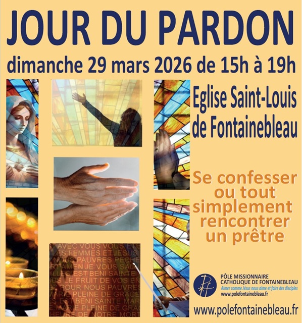 Le dimanche des Rameaux, dimanche 29 mars aura lieu, comme chaque année, à l’église Saint-Louis de Fontainebleau, de 15h à 19h, le dimanche du Pardon. Plus de vingt prêtres seront à votre disposition soit pour un temps d’écoute soit pour que nous puissions vivre le sacrement de la Réconciliation. Venons nombreux préparer notre cœur pour accueillir la joie de Pâques avec un cœur renouvelé.