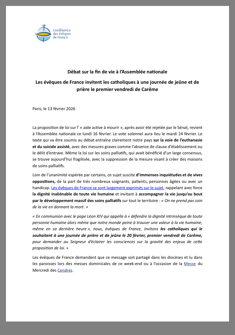 Euthanasie: l’Église Catholique invite à une journée de jeûne et de prière le vendredi 20 février