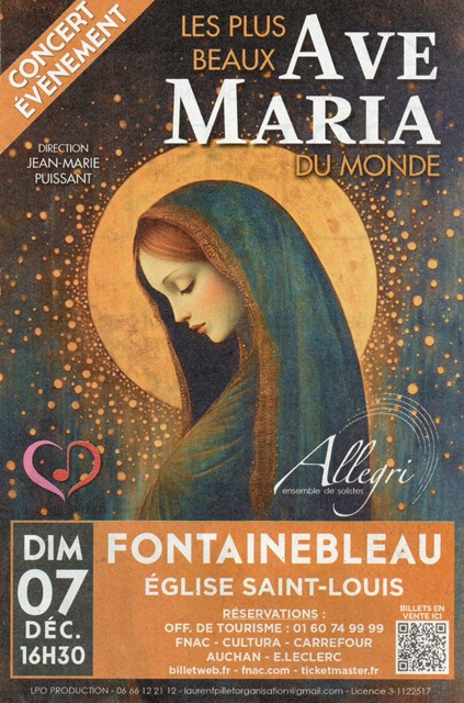 Le 7 décembre à 16h30 en l’église Saint-Louis de Fontainebleau, venez écouter l’ensemble Allegri, sous la direction de Jean-Marie Puissant. Renseignements à l’Office du Tourisme de Fontainebleau.