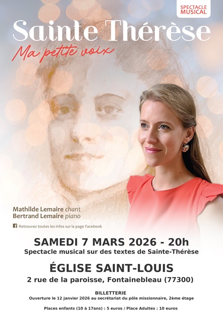 Le samedi 7 mars à 20h, en l’église Saint-Louis de Fontainebleau, ne manquez pas l’exceptionnel récital proposé par la cantatrice Mathilde Lemaire : celle-ci, accompagnée d’un pianiste, chante des textes de Sainte Thérèse de l’Enfant Jésus.